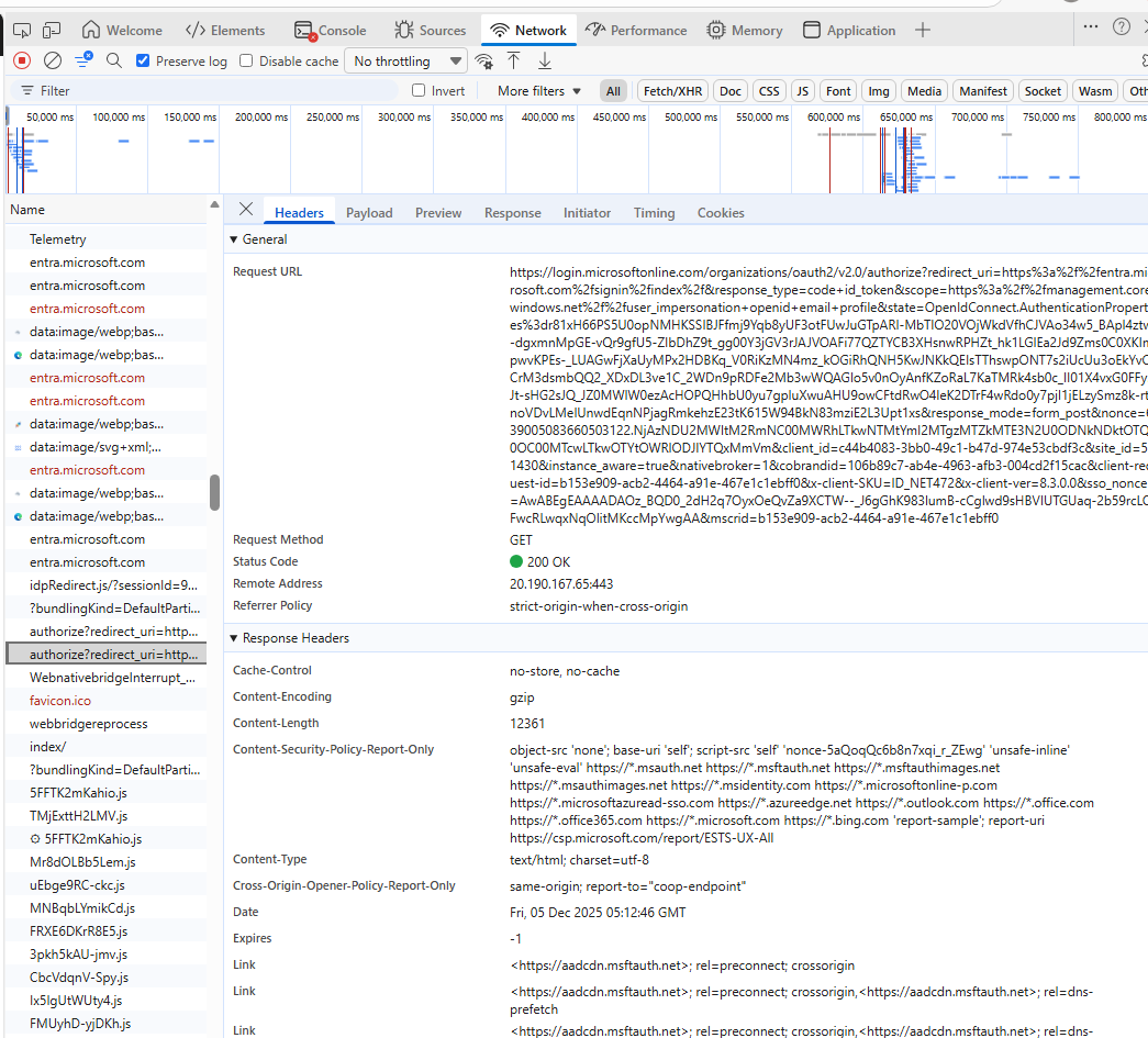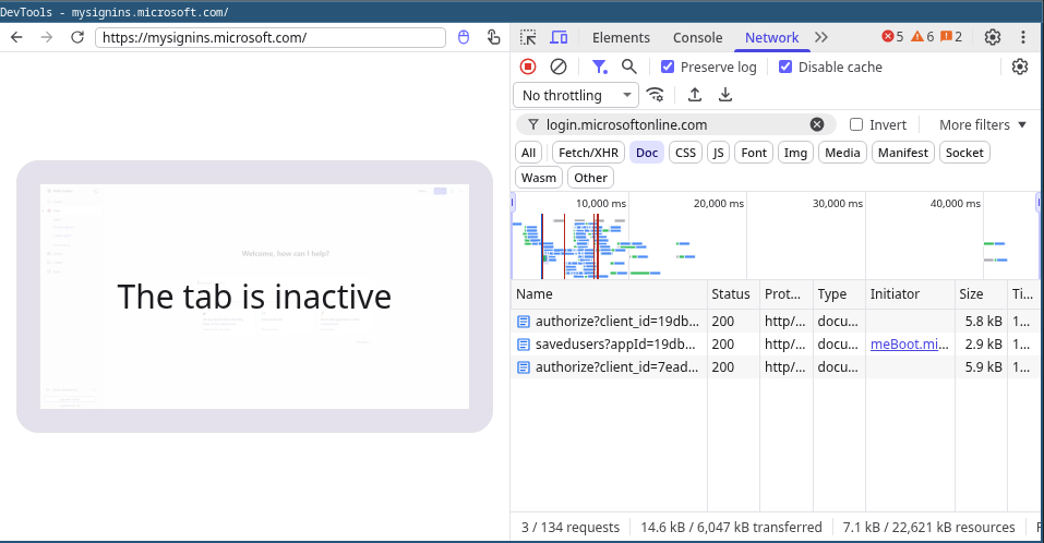 Two requests to the login.microsoftonline.com authorize endpoint stand out during the authentication flow: