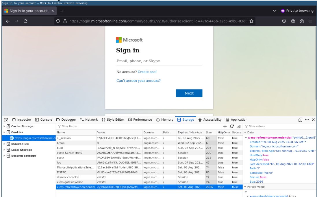 A replay attack is possible here. The attacker opens their own browser on an unrelated attacker-controlled host and enters the refresh token data into a cookie. The following screenshot shows browsing to https://login.microsoftonline.com in Firefox, then adding the x-ms-RefeshTokenCredential value using the developer tools by clicking the + icon in the top right. The x-ms-refreshtokencredential cookie value is copied from the second in the auth flow, so it has the sso_nonce value:
