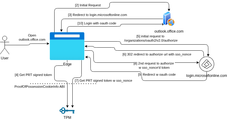 Poking around in DevTools shows that requests to login.microsoftonline.com include the x-ms-RefreshTokenCredential and x-ms-RefeshTokenCredential headers. The x-ms-RefreshTokenCredential header in the first request causes login.microsoftonline.com to reply with a 302 redirect and an sso_nonce. The x-ms-RefreshTokenCredential token in the second request includes this nonce value, and lets the authentication complete.