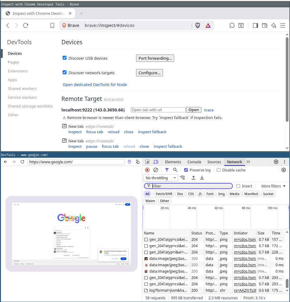 PS C:\Users\DenisAndzakovic> ssh -R 9222:127.0.0.1:9222 doi@192.168.122.169 Linux DESKTOP-1B6012 6.1.0-41-amd64 #1 SMP PREEMPT_DYNAMIC Debian 6.1.158-1 (2025-11-09) x86_64 The programs included with the Debian GNU/Linux system are free software; the exact distribution terms for each program are described in the individual files in /usr/share/doc/*/copyright. Debian GNU/Linux comes with ABSOLUTELY NO WARRANTY, to the extent permitted by applicable law. Last login: Fri Dec 5 17:46:46 2025 from 192.168.122.216 doi@DESKTOP-1B6012:~$