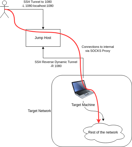 With ssh.exe available by default in Windows, we can now tunnel out from our Windows based device to a jump host and use the -R flag. With only a port specified, -R will open a SOCKS proxy port on the jump host. This is known as Reverse Dynamic TCP forwarding and has been supported since OpenSSH 7.6. We can then point whatever tools we like at this SOCKS port and our traffic will pop out on the laptop.