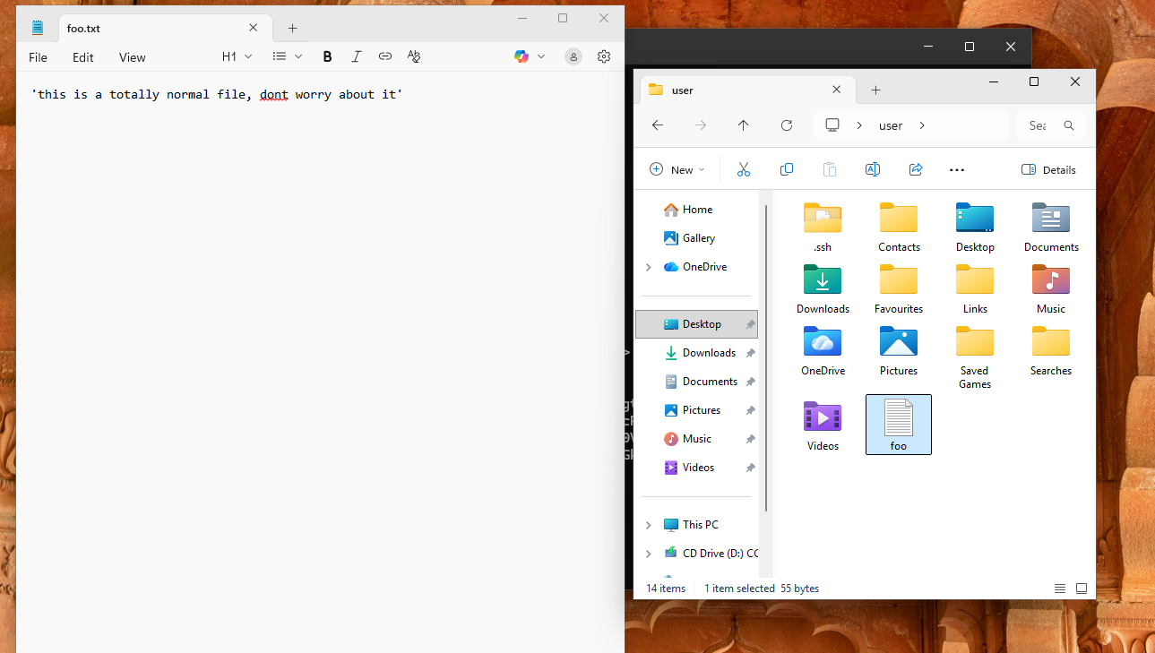 C:\Users\user>echo 'this is a totally normal file, dont worry about it' > foo.txt