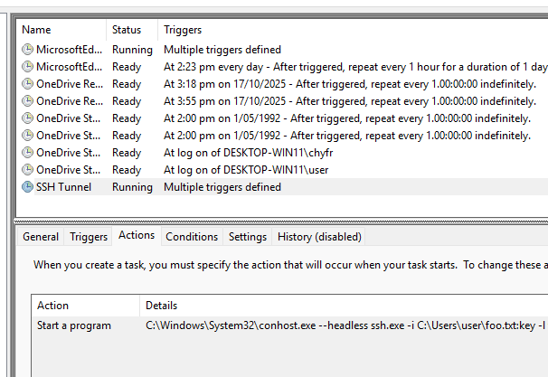 And there you have it. Combining built-in ssh.exe for remote network access, sshd.exe for an interactive shell and scheduled tasks for persistent execution.