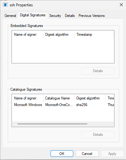 Other controls like preventing uncommon executable execution don’t really help us a huge amount here, since ssh.exe is a well known executable packaged with Windows by default, and sshd.exe is also supplied by Microsoft.